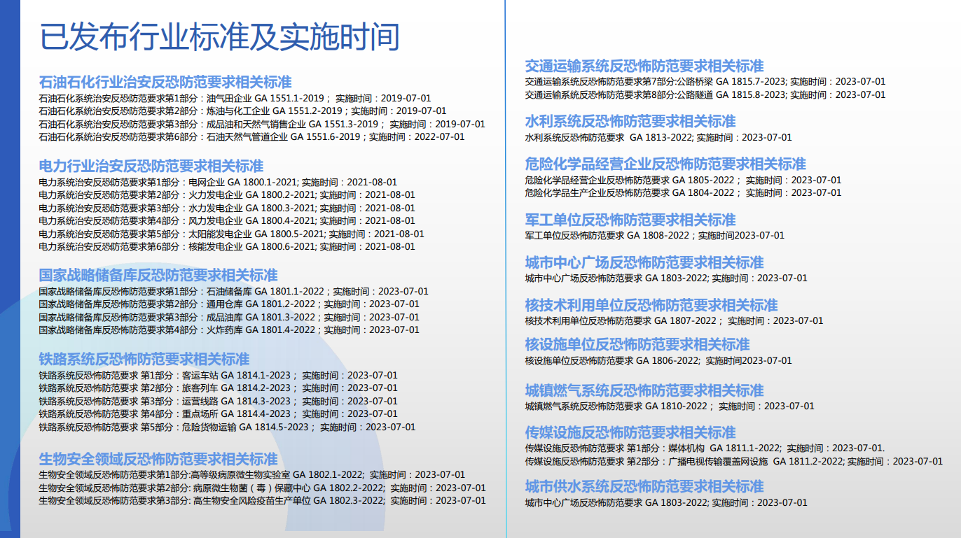 包括电力系统、石油石化、国家储备库、交通运输生物安全、铁路、危化品等行业在内已有多达数十个行业发布治安反恐防范要求,中联金冠针对行业特点定制化提供整体解决方案并负责通过反恐达标验收。